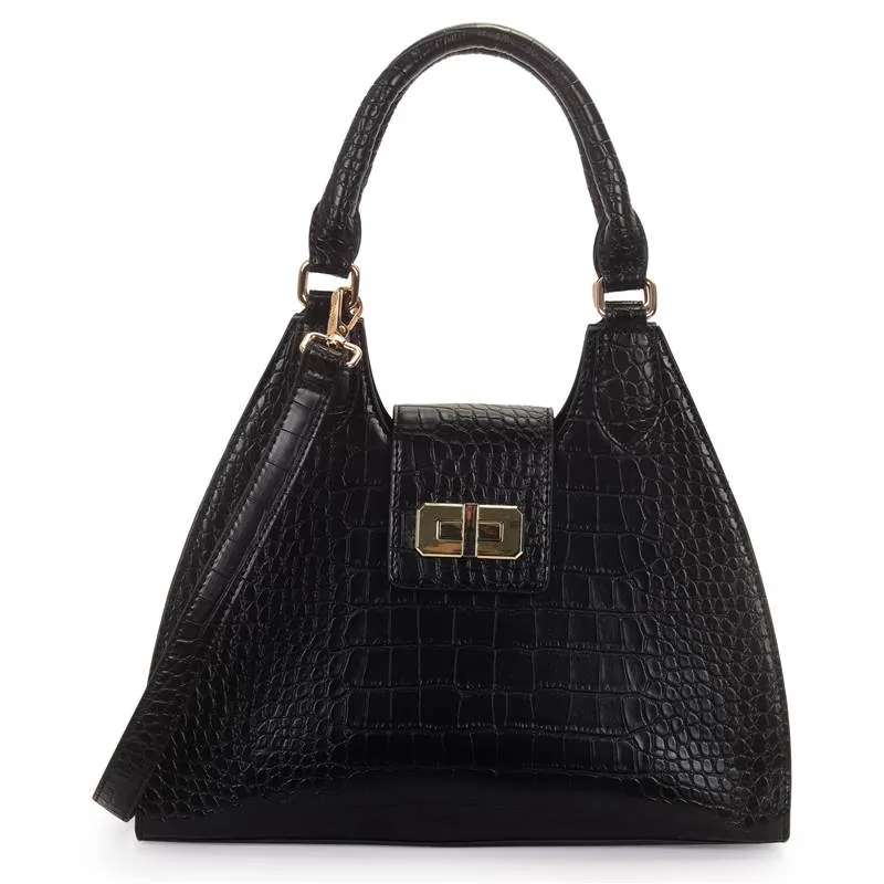 A Bolsa Satchel Média em croco estruturada com fecho é sinônimo de elegância clássica. A textura sofisticada valoriza o design firme, enquanto o fecho traz segurança e charme atemporal para produções refinadas.