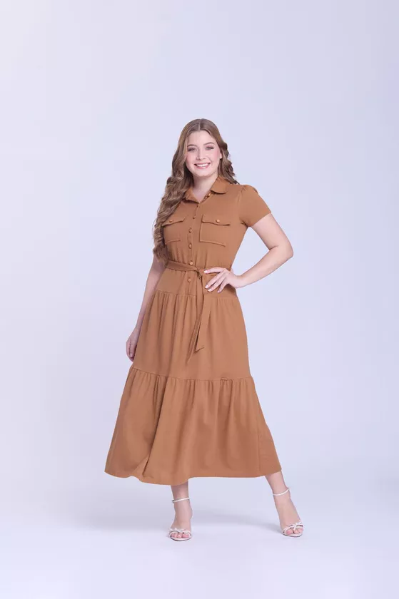 O vestido Carolina foi confeccionado em malha com textura parecida com ribana. O modelo apresenta decote com gola, fechamento frontal por botões, as mangas são curtas com franzido, os bolsos são funcionais, exibe passantes e acompanha faixa, o shape é soltinho e possui forro. O vestido Carolina traz um ótimo caimento e vestibilidade, sendo ideal para quem busca um look confortável.